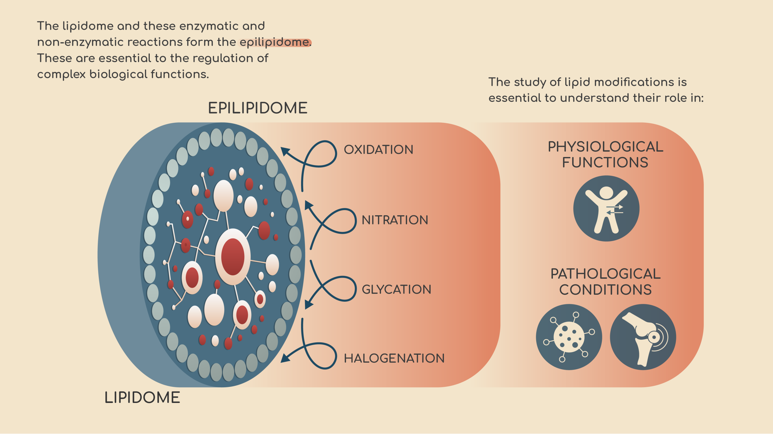 The native lipidome comprises hundreds of lipid molecular species that facilitate myriad functions in biological systems. To maintain this lipid diversity and to support rapid lipid remodelling essential for plasticity and adaptation, living systems employ a network of chemical modifications of existing lipids. These modifications, which include enzymatic and non-enzymatic reactions such as oxidation, nitration, sulfation, halogenation, etc, form the epilipidome—a subset of the natural lipidome essential for regulating complex biological functions.
